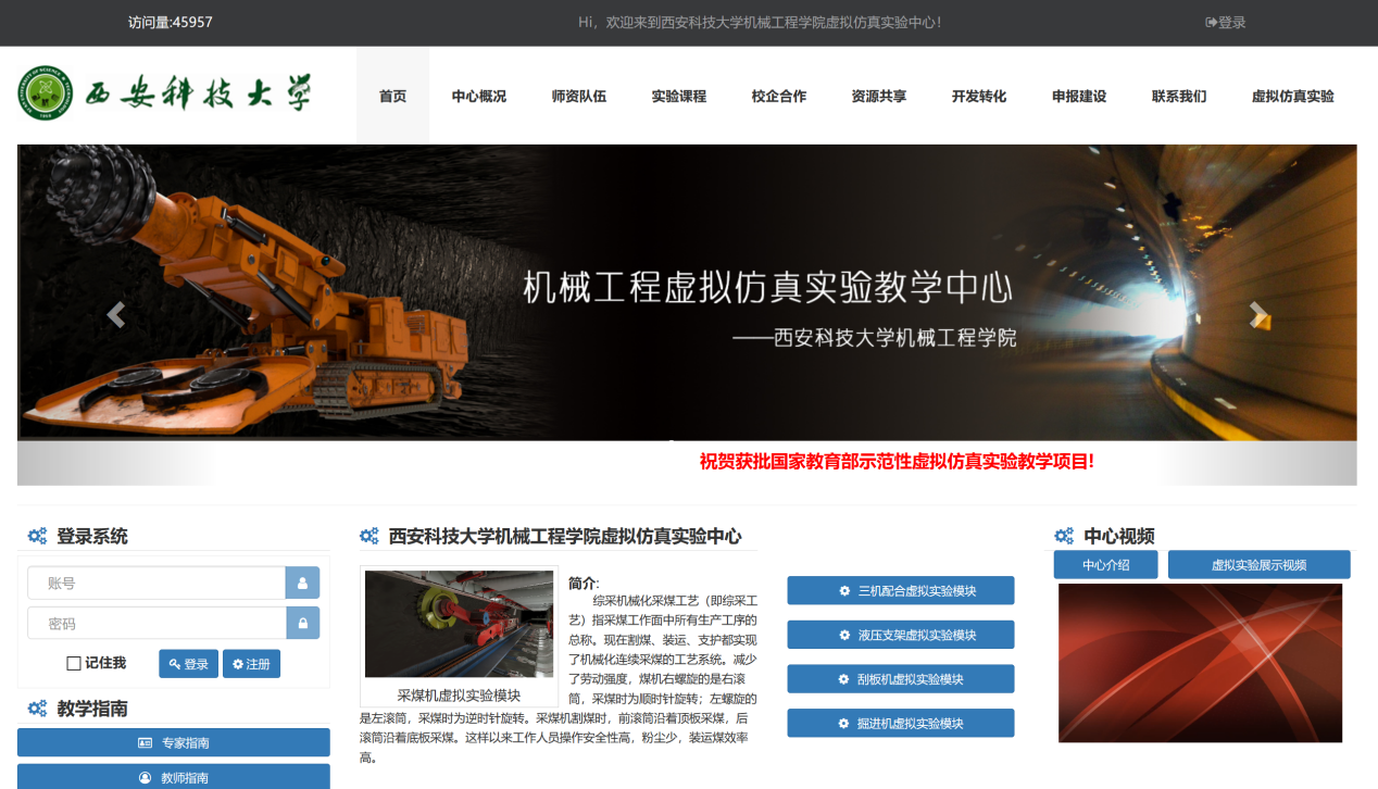 我院实验中心最早可追朔到1958年的矿山机电实验室,2007年获批陕西省机械工程实验教学示范中心,2017年获批陕西省虚拟仿真实验教学中心,2018年“煤矿综采综掘机械虚拟仿真实验”获批教育部首批虚拟仿真实验教学项目。