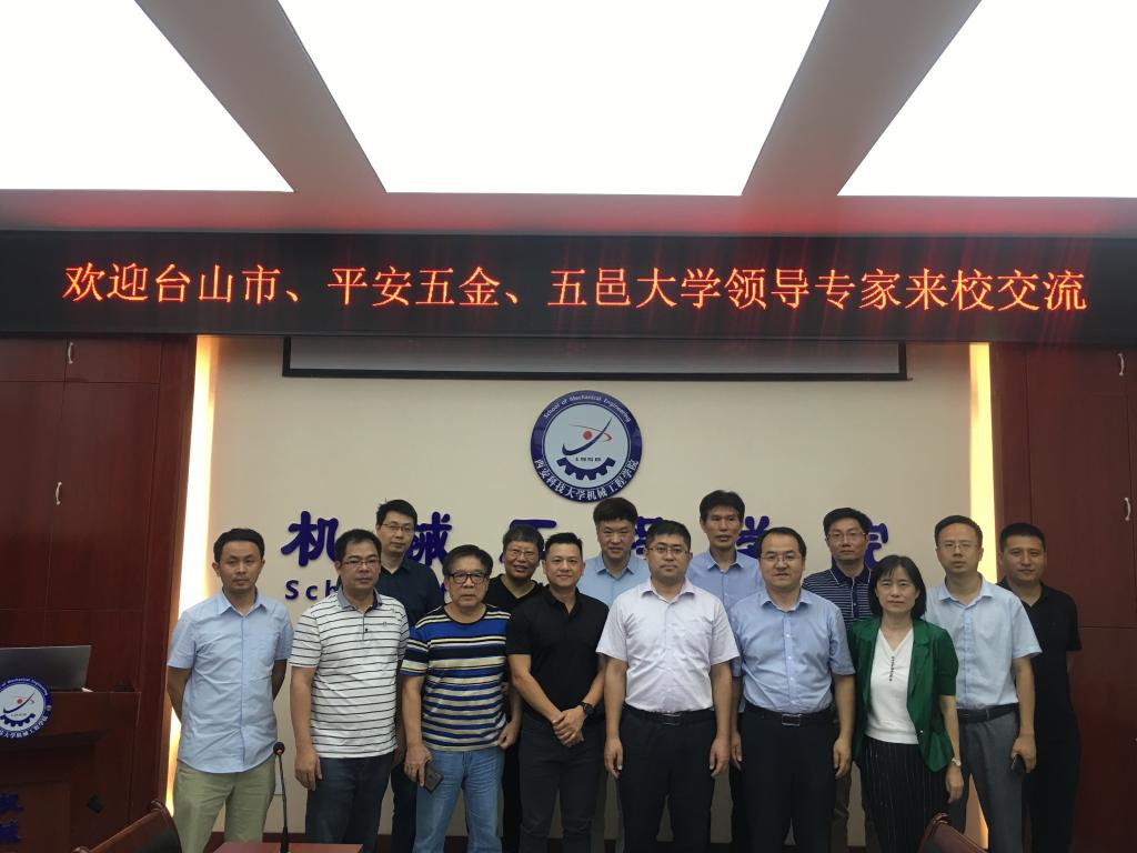 8月27日上午,广东台山、江门市部门领导专家一行来校交流,交流座谈会在雁塔校区我院学术报告厅举行,台山市人力资源保障局专业技术人员管理股苏惠武股长、综合股科员李星元、五邑大学智能制造学部王大承教授、平安五金制品有限公司总经理蔡志伟、总经理助理徐晓勤,机械工程学党委书记张金来、理学院院长李明、9999js金沙老品牌副院长寇发荣,以及学院骨干教师薛河教授、龚晓燕教授、赵宽博士等参会。会议由副院长寇发荣主持。