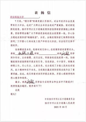 2021月7月底,“德尔塔”病毒突袭江苏扬州,对广大群众生命安全造成严重威胁。西安科技大学我院机械电子工程2021级学生刘超不畏艰险,勇于担当,在经过疫苗注射和核酸检测后加入了首批抗疫志愿者队伍,并担任组长,积极奋战在抗疫第一线,协助医疗人员进行全市核酸检测工作,与交警维持卡口交通管制等,与其他志愿者齐心协力共同筑起疫情防控“铜墙铁壁”,为当地疫情防控做出贡献,受到******************扬州邗江区方巷镇委员会的高度评价与肯定。