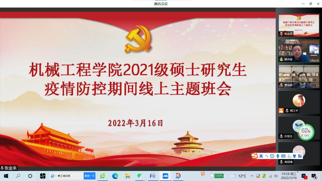 为进一步做好校园新冠肺炎疫情防控,增强雁塔校区研究生疫情防控的思想认识和行动自觉,积极推进研究生教育教学工作,3月16日至17日,我院以腾讯会议在线举行了硕士研究生、博士研究生疫情防控期间线上主题班会,副校长黄英维、我院党委书记张金来、副院长曹现刚、研究生辅导员以及全体研究生参加了主题班会。院党委副书记尹弘主持主题班会。