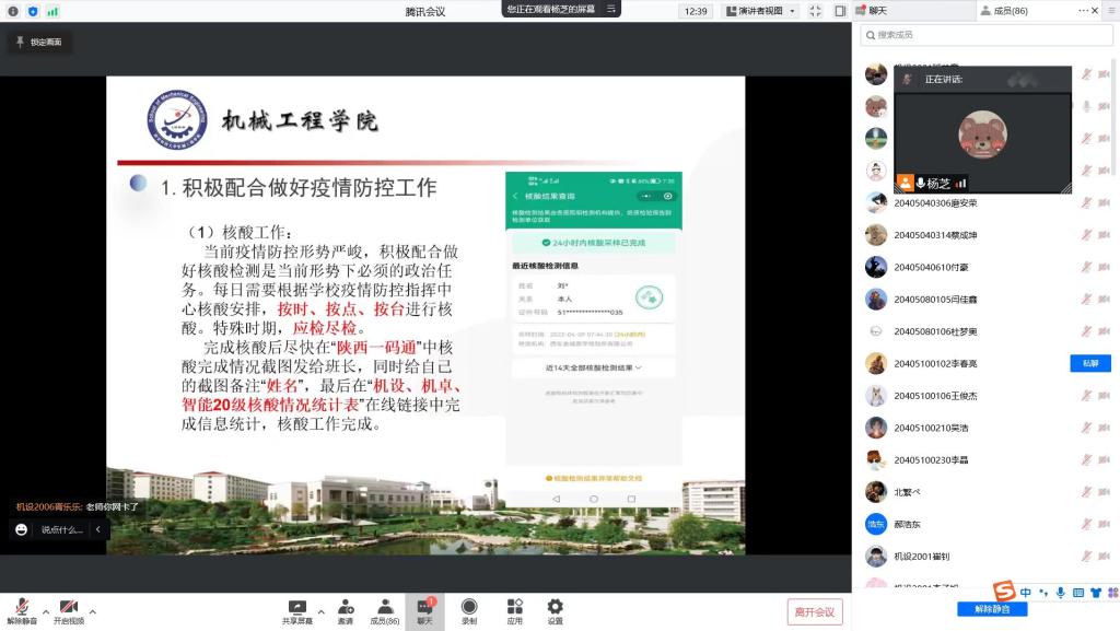 会上,各年级辅导员对奥密克戎病毒引发国内新一轮疫情以及西安本轮疫情传播链等信息做了通报。通过向学生进行“动态清零”“社会面清零”等词语解读,帮助大家充分了解当前我国新冠肺炎疫情防控的总方针;学习了“陕西省卫健委提示:无故不参加统一组织的核酸检测会违法”等案例,帮助学生进一步掌握疫情防控中可能出现的违法违规行为及可能产生的法律后果,引导学生自觉遵守《西安科技大学新冠疫情防控期间学生管理暂行规定》有关要求,依法依规做好核酸检测等工作,积极推动校园疫情防控工作高效进行。