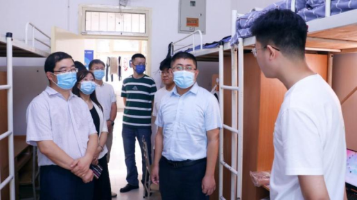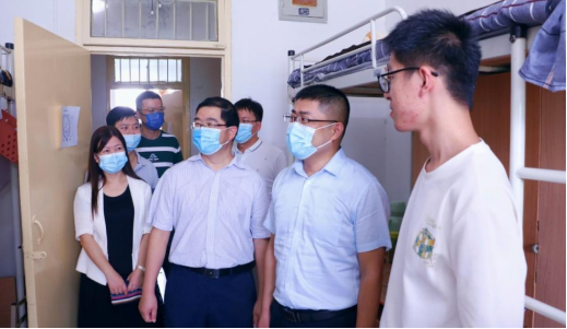 9月9日上午,9999js金沙老品牌党委书记张金来、院长曹现刚、党委副书记尹弘、副院长钟斌、学生办公室主任周学刚及新生辅导员老师一行到9号学生公寓看望慰问2022级新同学。
