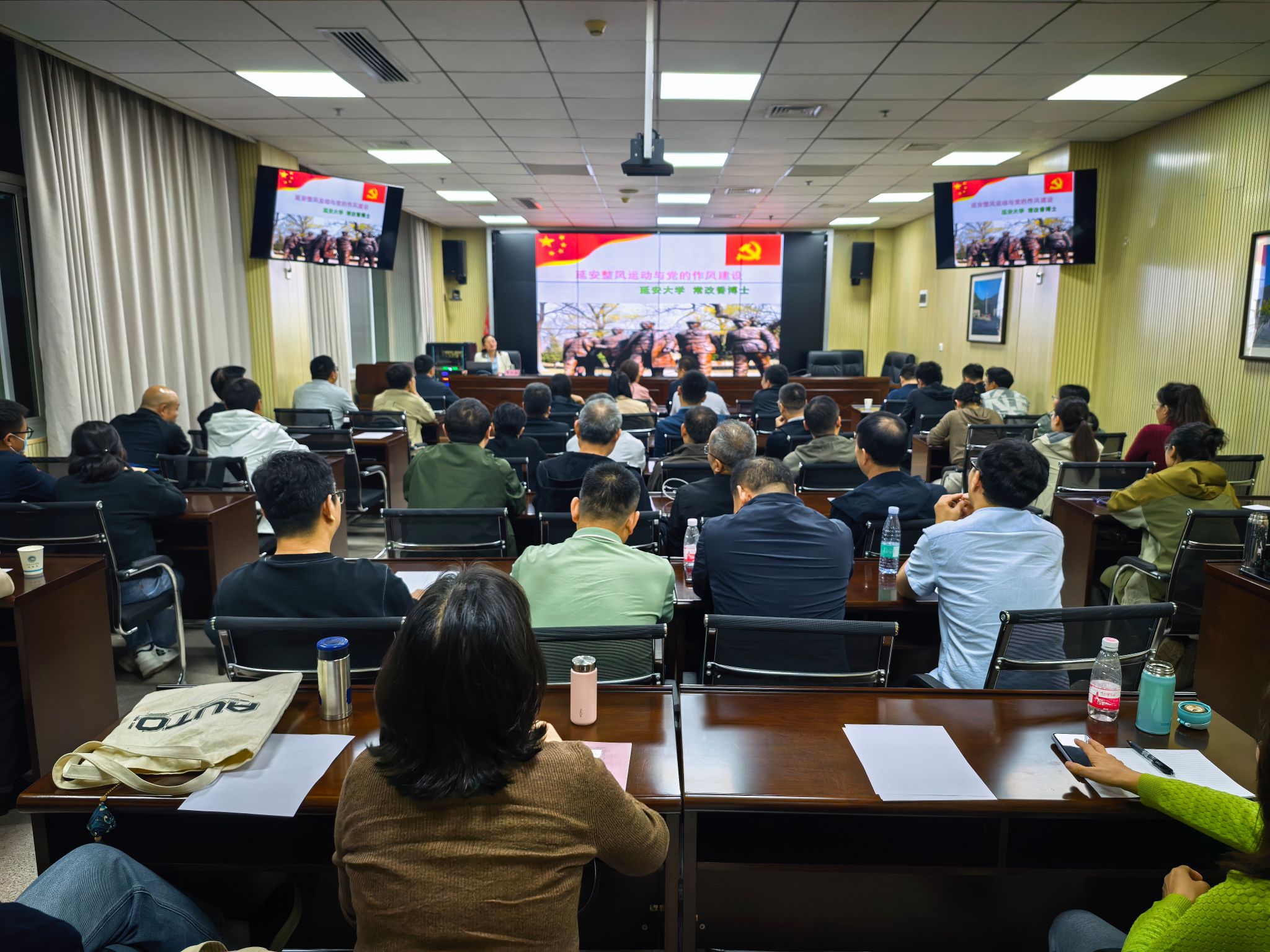 晚上,学习实践团成员在延安大学泽东青年干部学校现场聆听了由延安大学政法与公共管理学院院长常改香教授作的题为《延安精神的形成与当代价值》的专题报告,常教授从延安精神产生的社会历史条件、延安精神的基本内涵和延安精神的时代价值等三个方面,系统阐述了延安精神的核心要义,并结合当前实际,就新形势下教师如何弘扬延安精神、加强作风建设提出深刻见解。