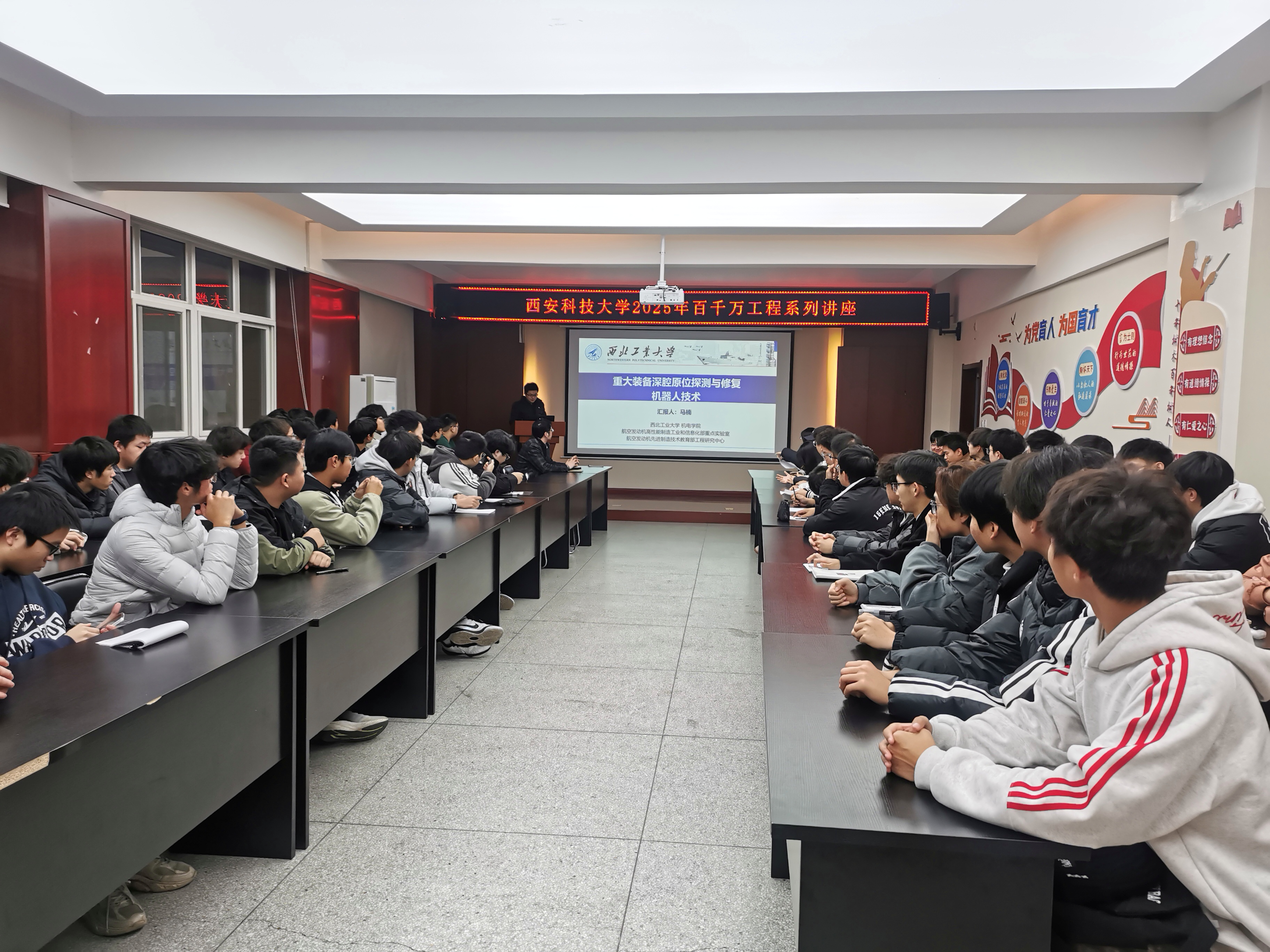 为深入贯彻落实《西安科技大学科研成果反哺教学工作实施管理办法(试行)》《西安科技大学本科生产教融合、科教融汇育人实施办法(试行)》以及《关于开展“百千万工程”系列讲座活动的通知》精神,激发学生对科学研究的兴趣、深化学生对科学研究的认知、提升学生的科研水平,加速形成新质生产力。12月4日晚,9999js金沙老品牌在骊山校园学院会议室举办“科技成果进课堂”(第五场)暨百千万工程系列报告会。本场讲座由机械制造系牵头组织,特邀西北工业大学机电学院马楠教授作题为《重大装备深腔原位探测与修复机器人技术》学术报告,学院近90名机械设计制造及其自动化(领军)、本硕连读班、机电专业优秀学生代表参加本次学习活动。学院副院长钟斌副教授主持讲座。